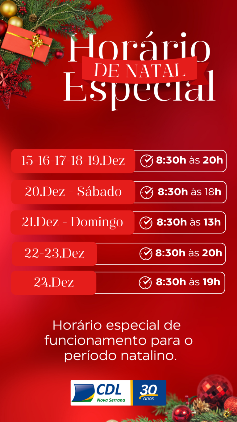 Horário especial de funcionamento para o período natalino. Natal dos Sonhos 2025O Natal é a principal data para o comércio varejista, marcando um período de grande movimento nas lojas e aumento expressivo nas vendas. Para ...